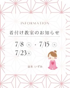着付教室開催予定(7月) 2025年5月16日 最終更新日時 : 2025年5月16日 izumoto 今後の開催予定をお知らせします。 参加者が増えそうな予感です。交流なども含めて楽しい時間にしていきたいですね 7月8日(火) 7月15日(火) 7月23日(水) お待ちしております。 。 FacebookXBlueskyHatenaPocketCopy